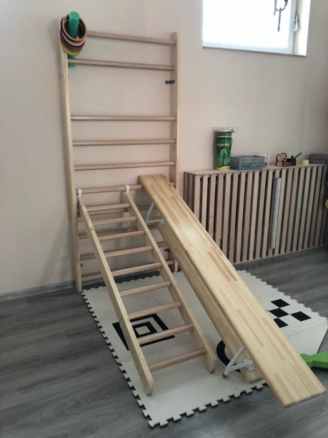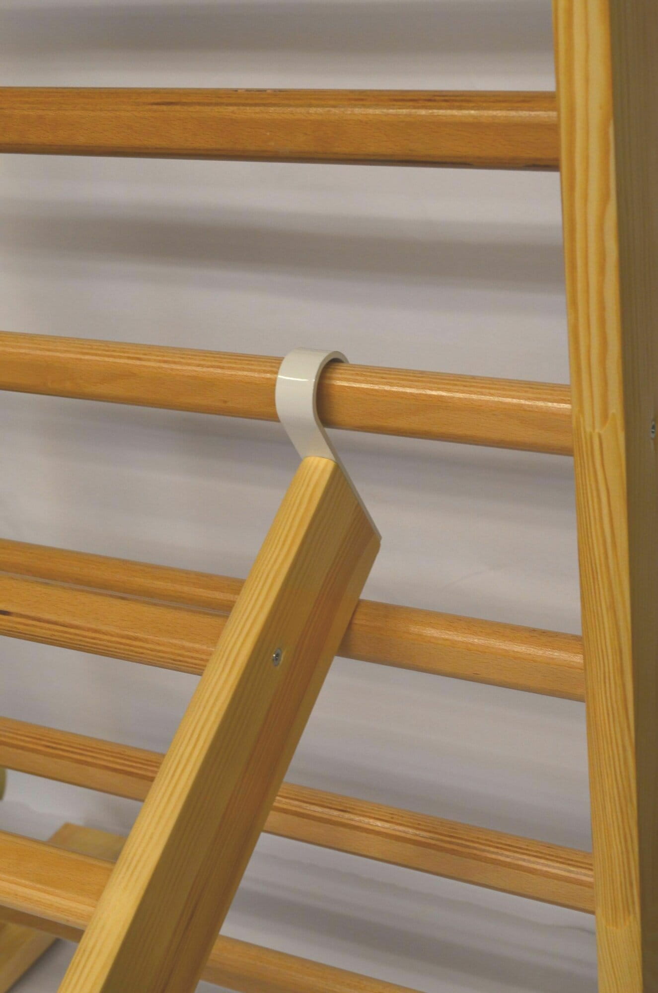 Funkcjonalna drabinka drewniana z zaczepem, służy do ćwiczeń poprawiających koordynację ruchową u dzieci. Boki drabinki wykonane są z drewna sosnowego lakierowanego 3-krotnie, a szczebelki ze sklejki 40x30 mm.