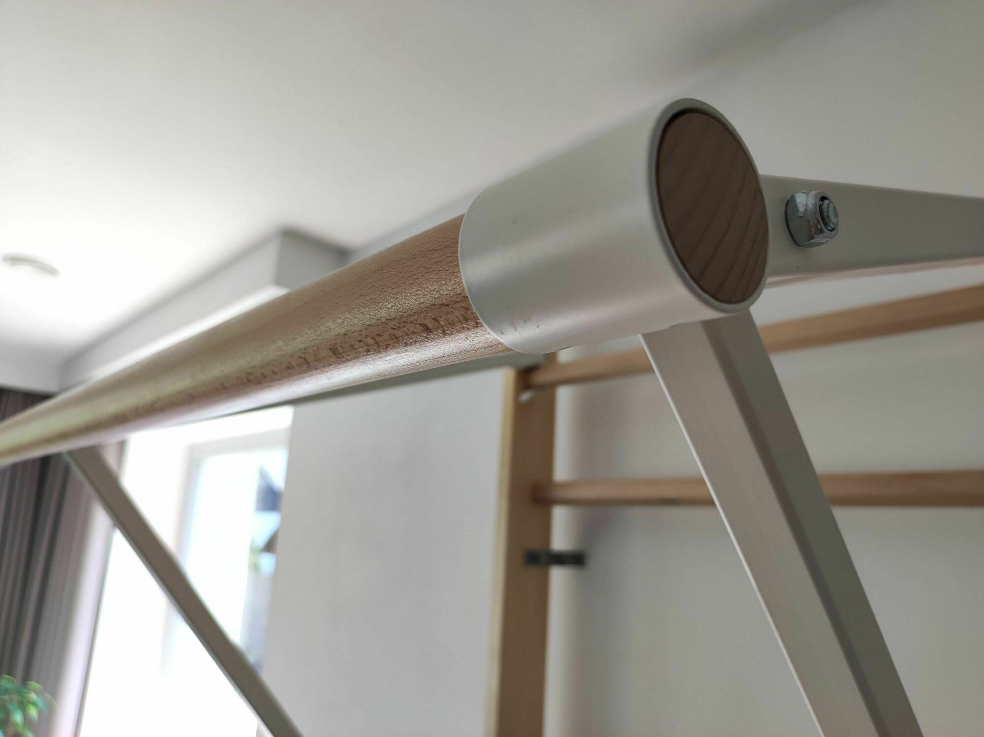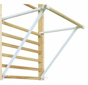Drążek gimnastyczny składany może być zawieszony na drabince gimnastycznej, tworząc idealny zestaw do ćwiczeń dla dzieci i dorosłych. Wykonany jest z drewna bukowego, ma ruchome ramiona umożliwiające regulację wysokości i odległości drążka od drabiny (długość ramion 1000 mm oraz 740 mm). Maksymalne oddalenie drążka od szczebla drabinki gimnastycznej przy poziomym ustawieniu drążka w stosunku do szczebla na którym zamocowane jest ramię górne wynosi około 900 mm. Maksymalne statyczne obciążenie 120 kg. Wykonany jest z klejonego drewna bukowego.