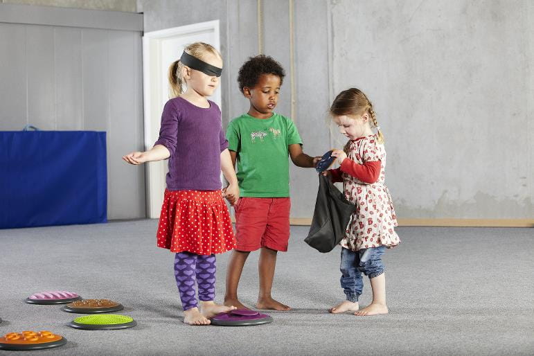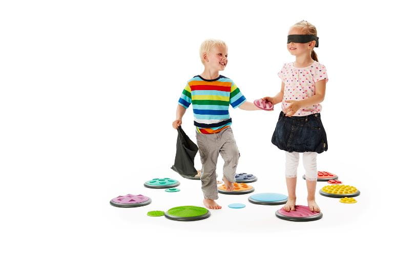 Sensoryczne dyski wykonane z przyjemnych w dotyku materiałów. Każdy z dysków posiada inny kolor i inną fakturę na swojej powierzchni. Dzieci mogą dotykać dysków rękoma i stopami jednocześnie rozwijając zdolność do rozpoznawania kształtów oraz opisywania wrażeń zmysłowych. W zestawie dostępne są duże i małe dyski, można je wykorzystywać na różne sposoby, zwiększając lub zmniejszając poziom trudności zabawy, np. duży dysk dziecko dotyka stopami i rękoma odszukuje mały o tej samej strukturze.