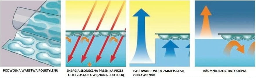 Podstawowym zadaniem basenowej folii solarnej jest ochrona basenu przed stratami ciepła oraz dzięki zastosowaniu bąbelków powietrza pomoc w nagrzaniu wody w basenie. Oprócz tego folia bąbelkowa pozwala wyeliminować dostanie się zanieczyszczeń oraz stanowi barierę dla parowania wody. Około 70% strat energii cieplej powodowane jest parowaniem, dzięki zastosowaniu folii solarnej jesteśmy w stanie zmniejszyć stratę energii cieplnej o prawie 90%.