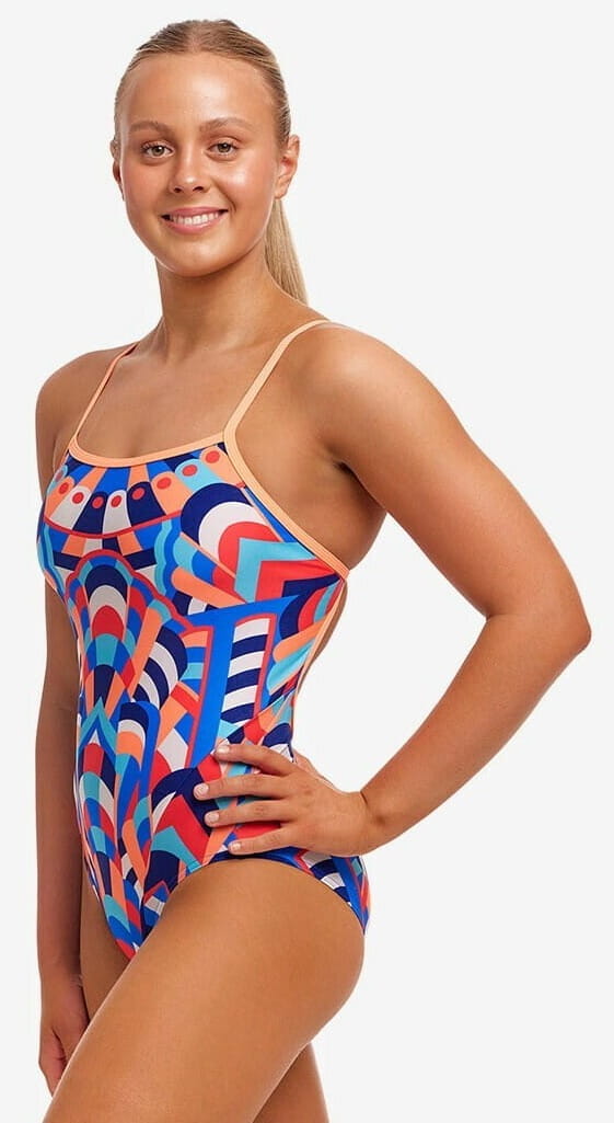 Jednoczęściowy strój kąpielowy wykonany ze specjalnej tkaniny C-Infinity odpornej na chlor. Z mocnymi ramiączkami i naturalnym wycięciem w biodrach, model Showtime zapewnia komfort w trakcie pływania. W przedniej części wszyto podszewkę gwarantującą dodatkowe wsparcie dla sylwetki. Kostium kąpielowy Funkita to idealny strój do pływania rekreacyjnego, jak i sportowego. Materiał, z jakiego został wykonany, to wysokiej jakości poliester zachowujący swoje barwy bez względu na to, jak często pływasz.