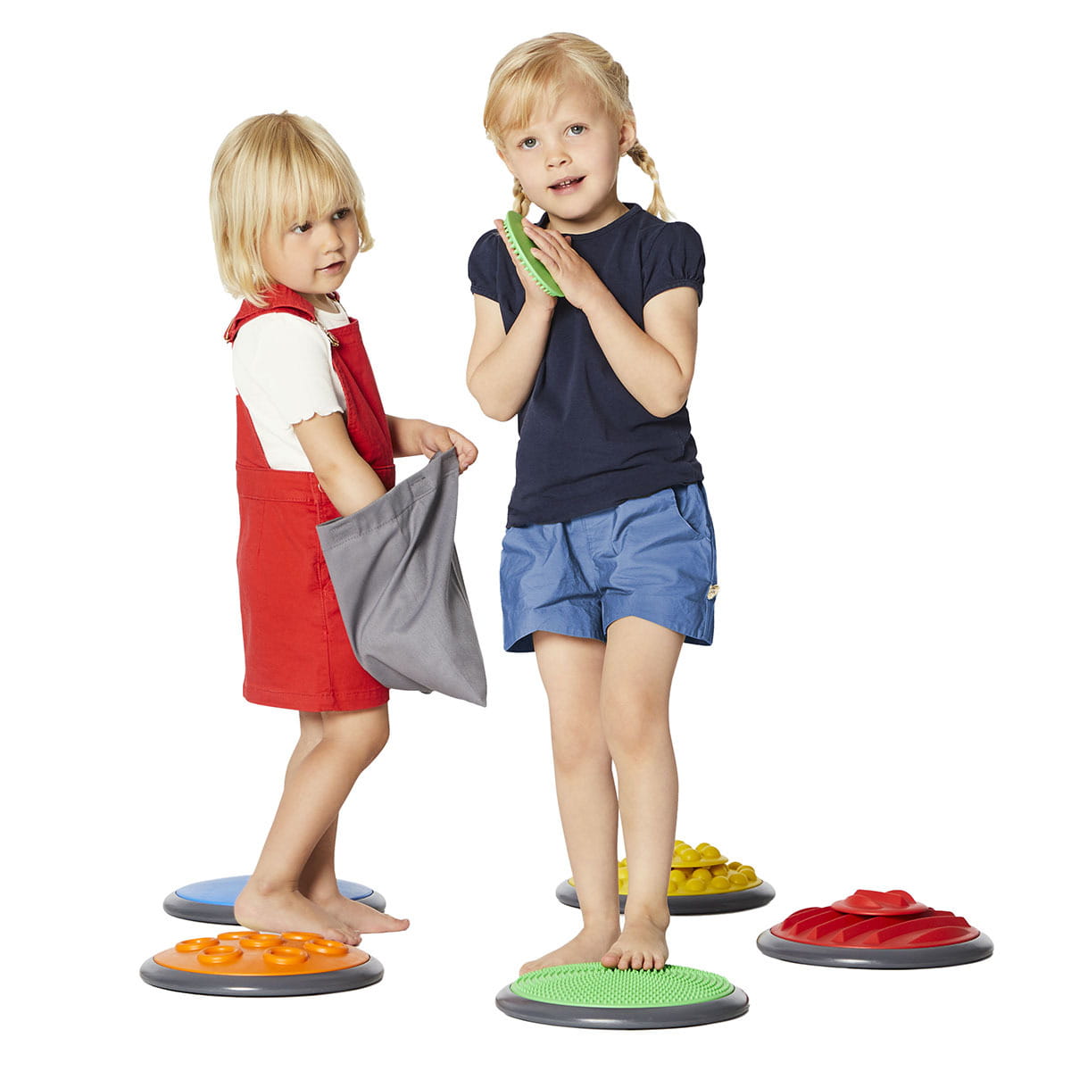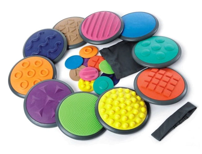 Sensoryczne dyski wykonane z przyjemnych w dotyku materiałów. Każdy z dysków posiada inny kolor i inną fakturę na swojej powierzchni. Dzieci mogą dotykać dysków rękoma i stopami i jednocześnie rozwijać zdolność do rozpoznawania kształtów oraz opisywania wrażeń zmysłowych.