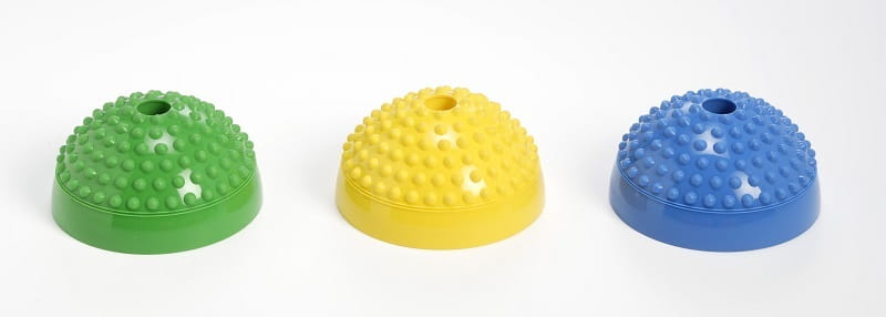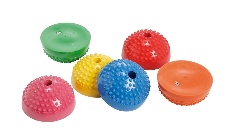 Zestaw 6 półkul posiadających na swojej powierzchni delikatne wypustki, które idealnie sprawdzą się podczas aktywności ukierunkowanych na rozwój propriocepcji czy zdolności równoważnych najmłodszych. Każda półkula została wykonana w innym kolorze, dzięki czemu możliwe jest tworzenie atrakcyjnych, kolorowych ścieżek, z których dzieci chętnie korzystają. Dodatkowo, półkule mogą być napełniane wodą w celu uzyskania ich wyższej stabilności, a w górnej części posiadają specjalny otwór na tyczkę lub kij gimnastyczny (o średnicy 2,5 cm), dzięki czemu możliwe jest jeszcze większe urozmaicenie zajęć ruchowych. Jeśli natomiast chcemy uzyskać większą niestabilność wystarczy je odwrócić. Gymnic Multiactiv Stones to niezwykle uniwersalny zestaw, który dzięki swoim właściwościom znajdzie zastosowanie podczas różnego rodzaju aktywności w domu, placówce edukacyjnej czy rehabilitacyjnej.