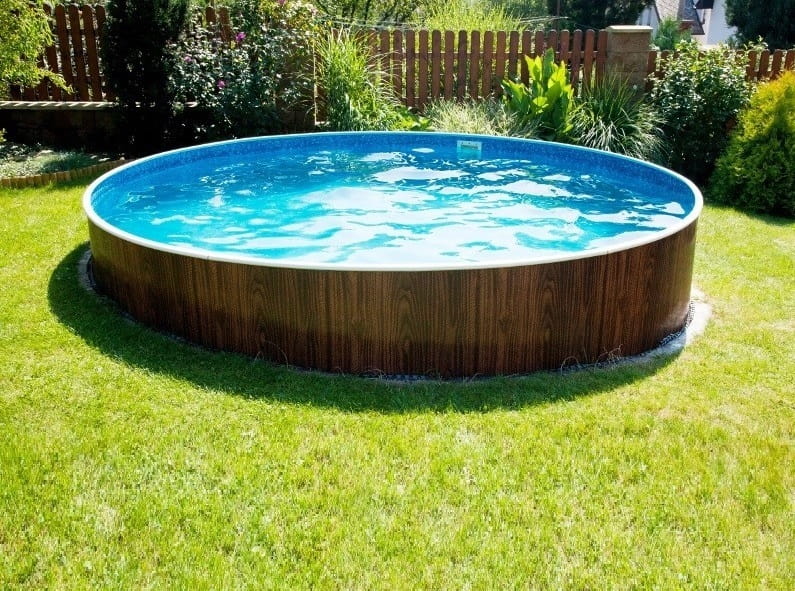 Zewnętrzny wzór basenu imitujący drewno sprawdzi się w większości ogrodów. Elegancki, wysokiej jakości nadruk sprawia jakby niecka była rzeczywiście pokryta drewnianymi panelami.