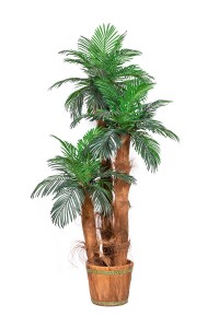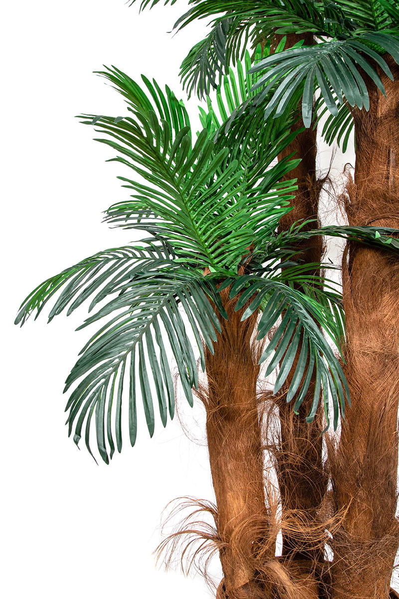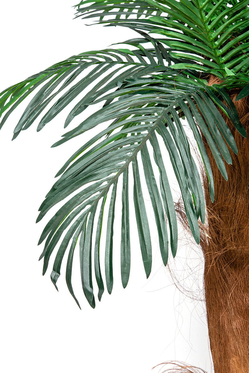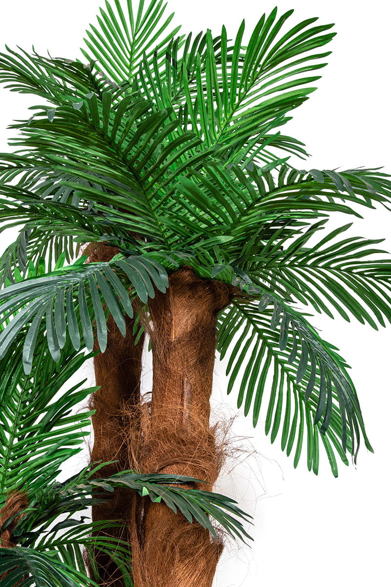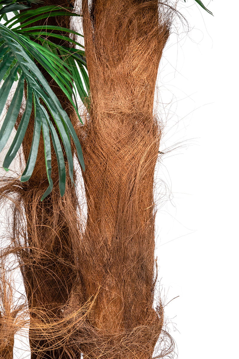Ta sztuczna palma składa się z 3 pni i kilkudziesięciu doskonale odwzorowanych liści (o długości ok. 50 cm). Pnie palmy otulone są naturalną korą palmową i osadzone są w estetycznej, stabilnej donicy palmy wykonany jest z naturalnej kory palmowej. W zestawie znajduje się również nietuzinkowa ręcznie zdobiona donica. Wysokość całkowita to 210 cm. Palma stwarza niepowtarzalny, egzotyczny klimat. Jest solidnie wykonana z dbałością o każdy detal.