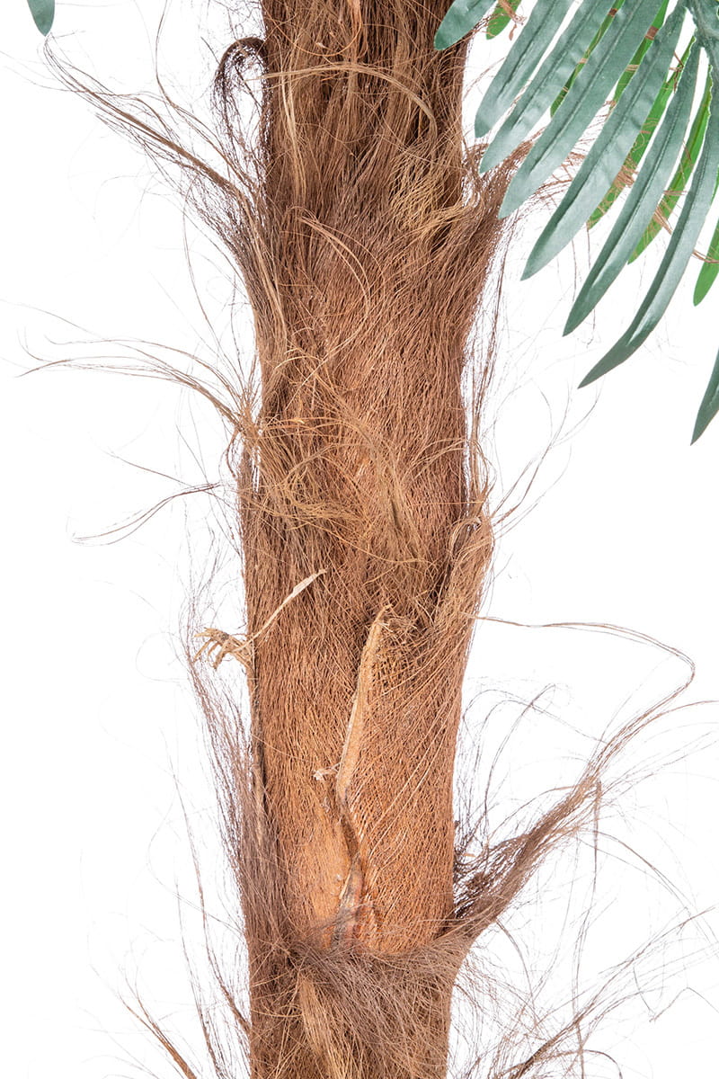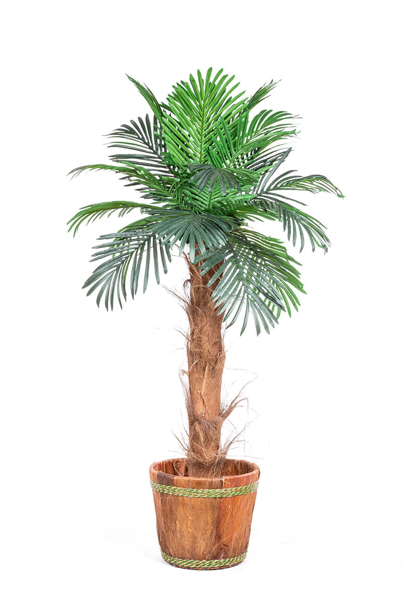 Sztuczne drzewko palmowe to świetny dodatek do Twojego domowego spa lub basenu. Uatrakcyjni też każdą powierzchnię w siedzibie firmy lub sklepie. Pień o długości 100/130 cm obłożony jest naturalną korą palmową. Koronę stanowi 16 sztucznych, zielonych liści.