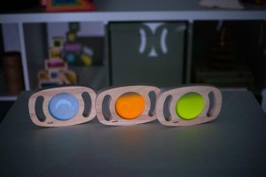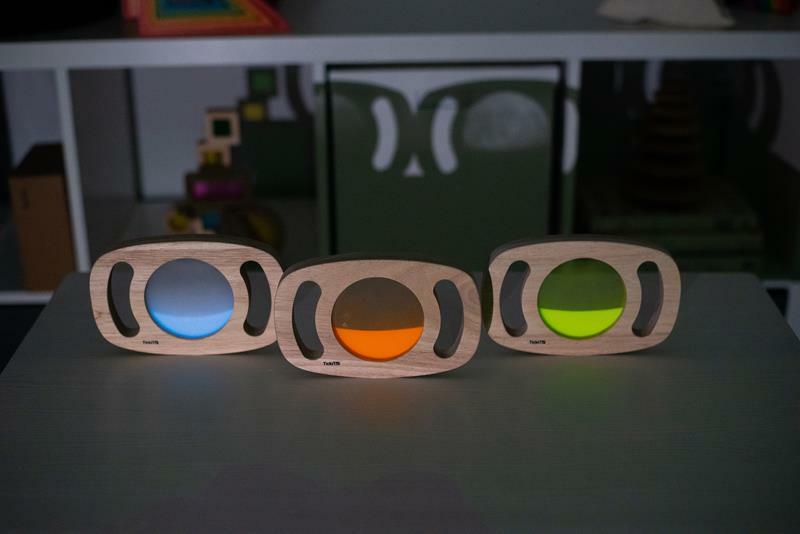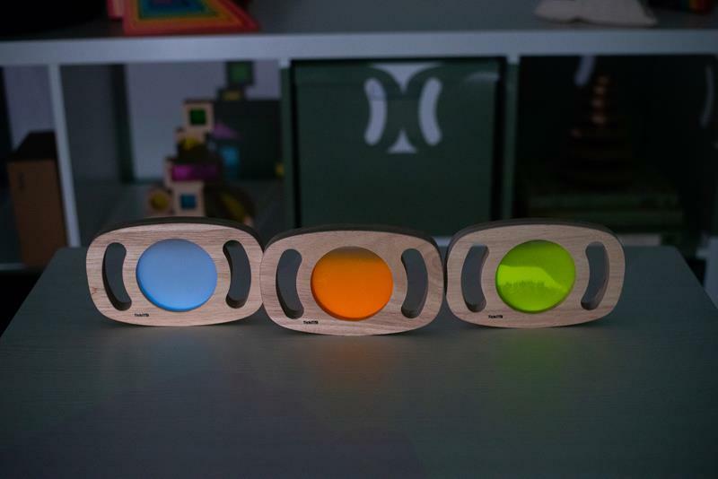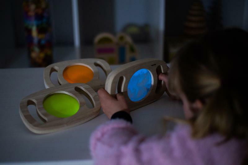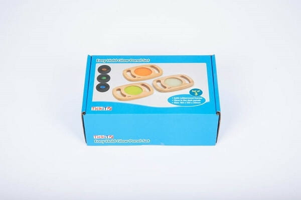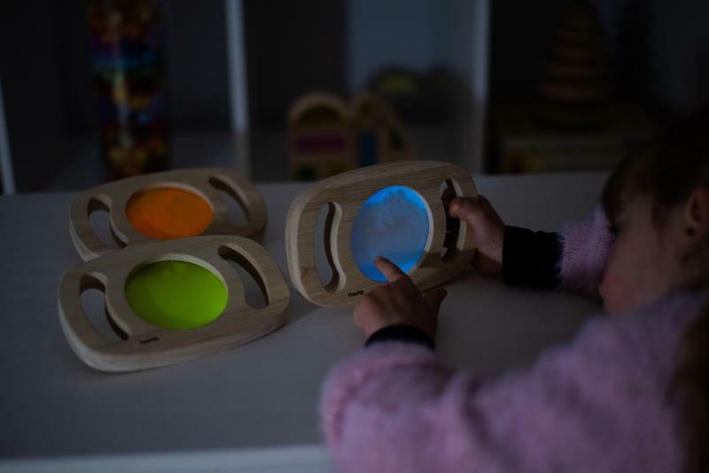 Nowość w serii Easy Hold marki TickIt. Piękne ramki z drewna kauczukowego z wygodnymi uchwytami zawierające fascynujące panele świecące w ciemności. Aktywowane przez pozostawienie w jasnym świetle, po zabraniu do ciemnej jaskini sensorycznej magicznie świecą żywymi kolorami - niebieskim, zielonym i pomarańczowym. Dzieci pokochają obserwowanie, jak świecąca ciecz wiruje i płynie, gdy przekręcają i obracają panele. Panel po wystawieniu na 15 minut światła słonecznego będzie świecić przez ok. 5-6godzin.