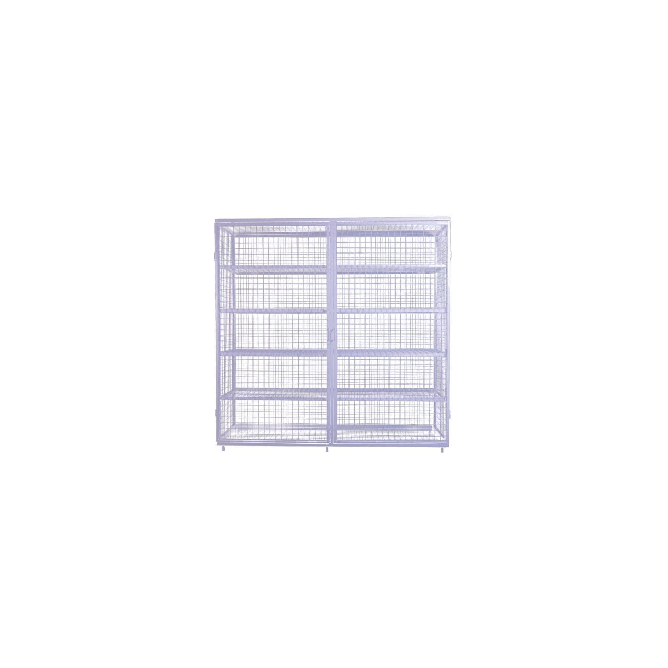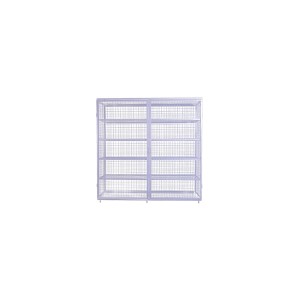 Właściwości techniczne: wymiary całkowite 2000 x 2000 x 600 mm, rama stalowa ciągniona na zimno 20 x 20 x 1,5 mm, siatka spawana 50 x 50 mm o grubości 5 mm, liczba półek 4 z regulacją wysokości, zabezpieczenie antykorozyjne, sześć gumowanych nóżek o długości 10 cm, podwójne zawiasy spawane do ramy, system zamykania na kłódkę.