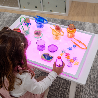 Dzięki prostemu w obsłudze, wbudowanemu przyciskowi dzieci mogą samodzielnie przełączać się między 8 intensywnymi kolorami światła, w tym czystą bielą oraz wybierać jeden z 3 poziomów jasności, dopasowując oświetlenie do wykonywanej aktywności. Panel tworzy idealne tło do nauki poprzez doświadczenie: badania światła i koloru, poznawania kształtów, pracy zespołowej czy spokojnej, indywidualnej zabawy.