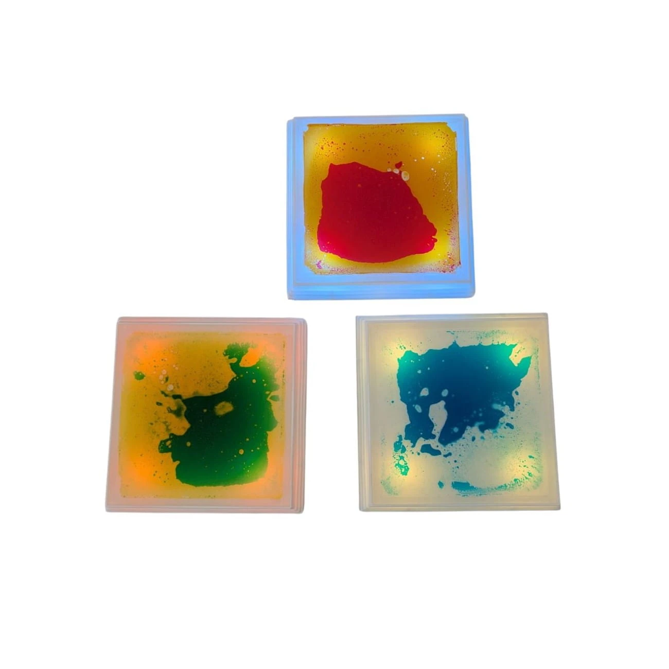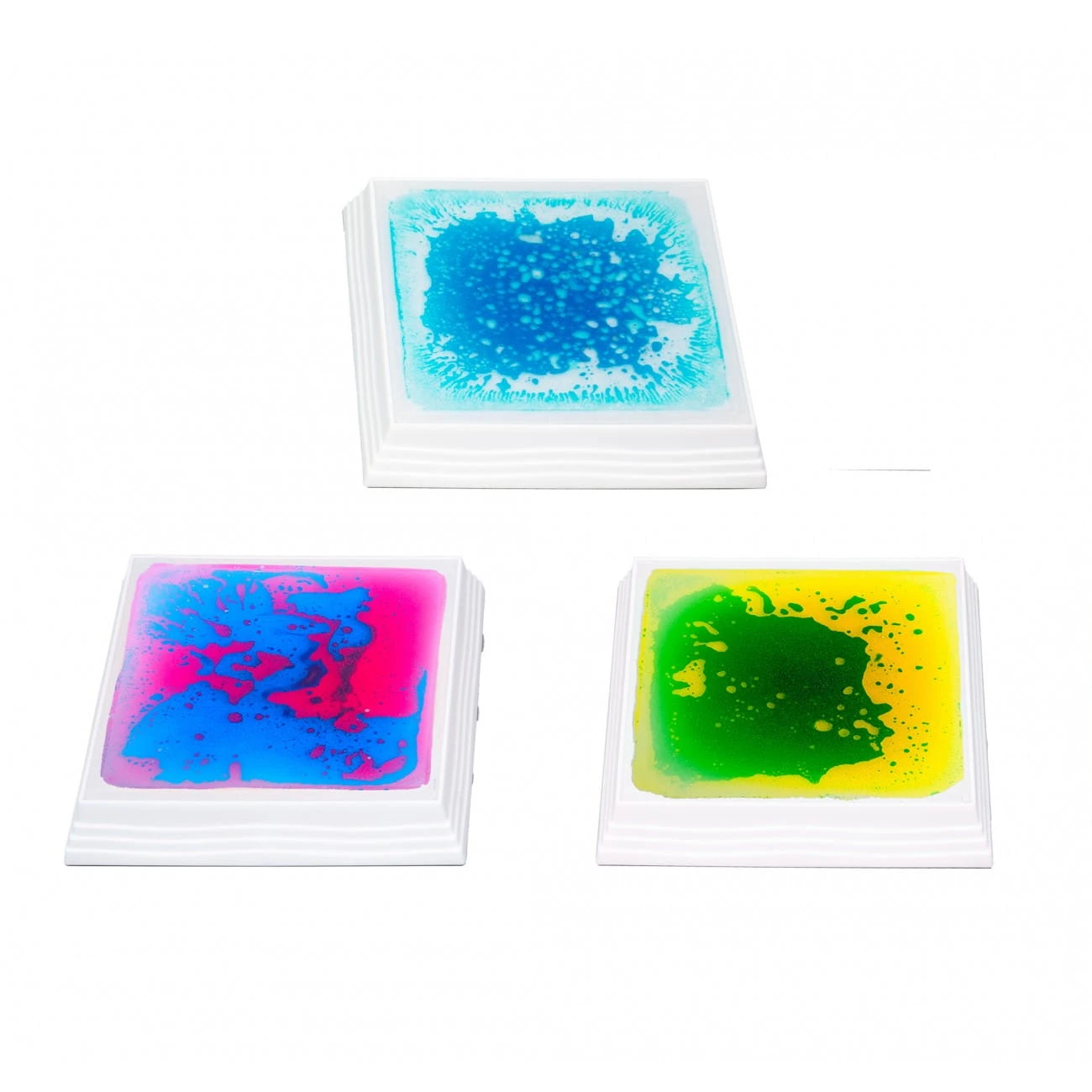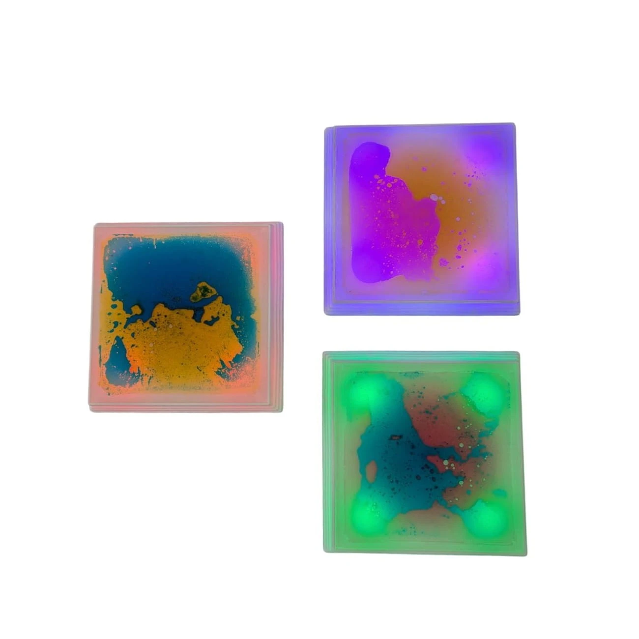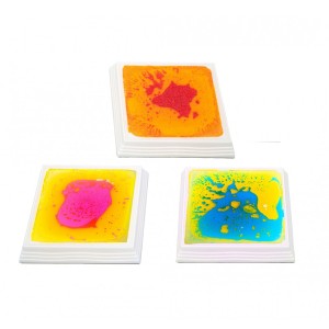 Kwadratowe sensoryczne płytki podłogowe z płynnym wnętrzem i podświetleniem LED reagują na dotyk i nacisk, tworząc kolorowe, dynamiczne wzory.