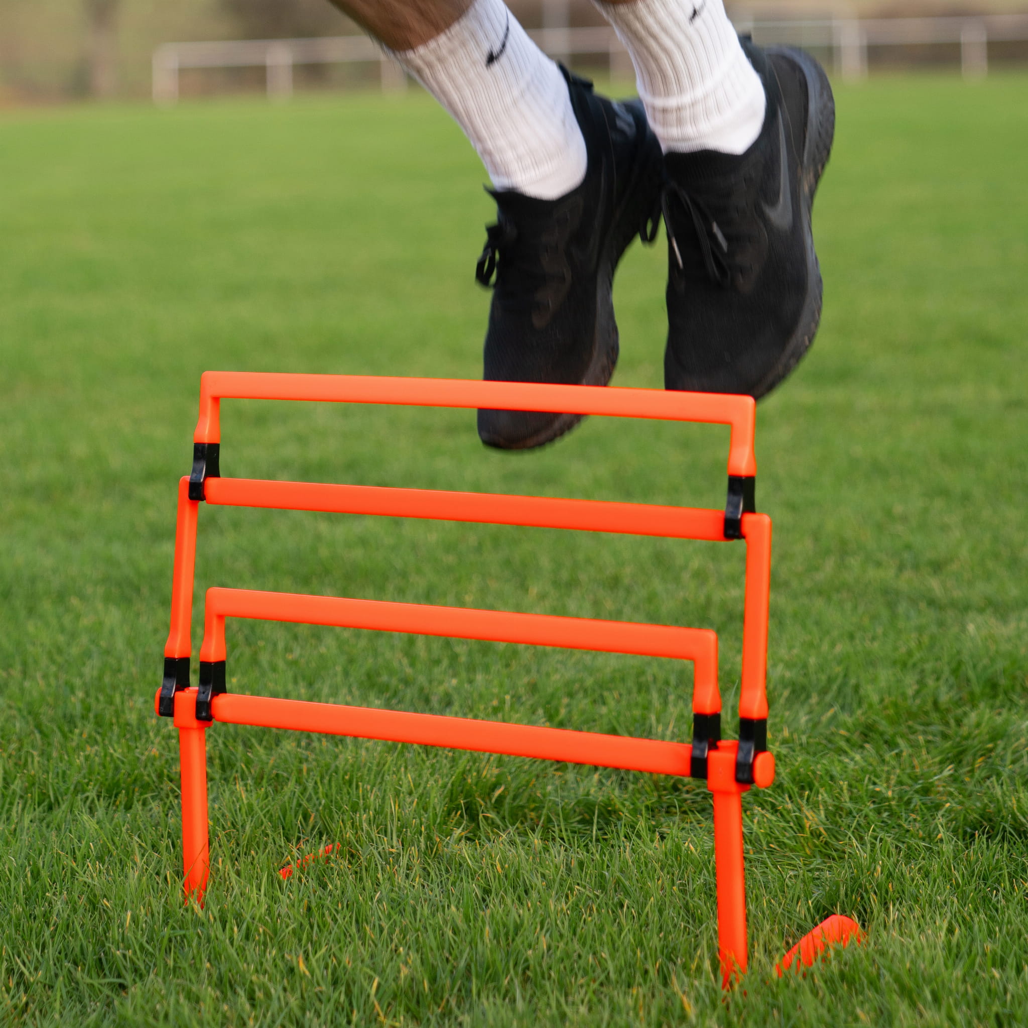Regulowane płotki treningowe Sport-Thieme z regulacją wysokości to funkcjonalna pomoc treningowa, idealna do ćwiczeń szybkościowych, koordynacyjnych, treningu plyometrycznego. Dzięki innowacyjnemu systemowi składania i prostokątnym uchwytom płotki można ustawić na czterech wysokościach: 20, 25, 33 i 40 cm. Umożliwia to dopasowanie intensywności treningu do poziomu zaawansowania zawodnika oraz specyfiki wykonywanych ćwiczeń. Konstrukcja została zaprojektowana tak, aby ułatwić transport – wystarczy złożyć nóżki do wewnątrz i ustawić płotek na najniższej wysokości, co pozwala zaoszczędzić miejsce. Mini płotki świetnie sprawdzają się zarówno podczas treningów piłkarskich, jak i w przygotowaniu motorycznym w innych dyscyplinach. Produkt dostępny jest pojedynczo lub w zestawie, idealnym do tworzenia torów i sekwencji treningowych.