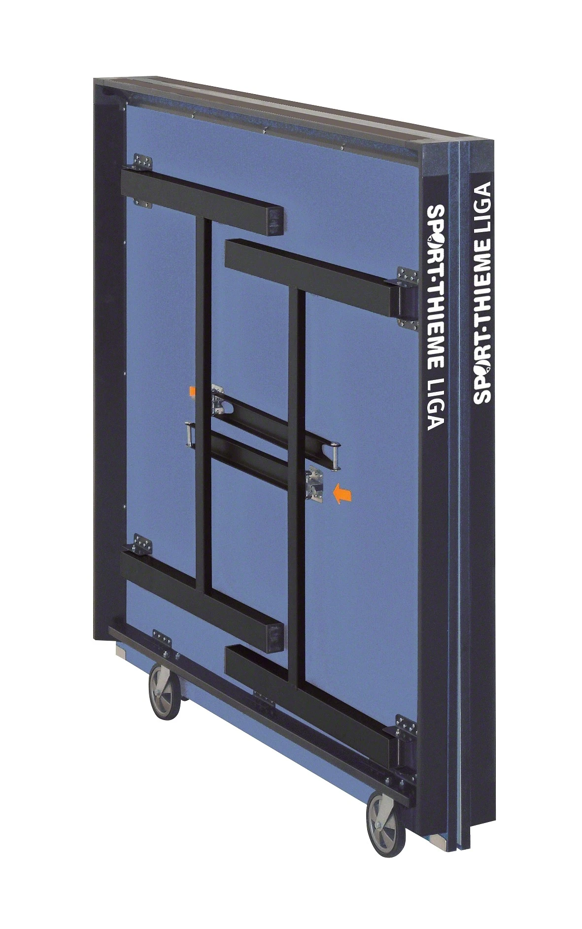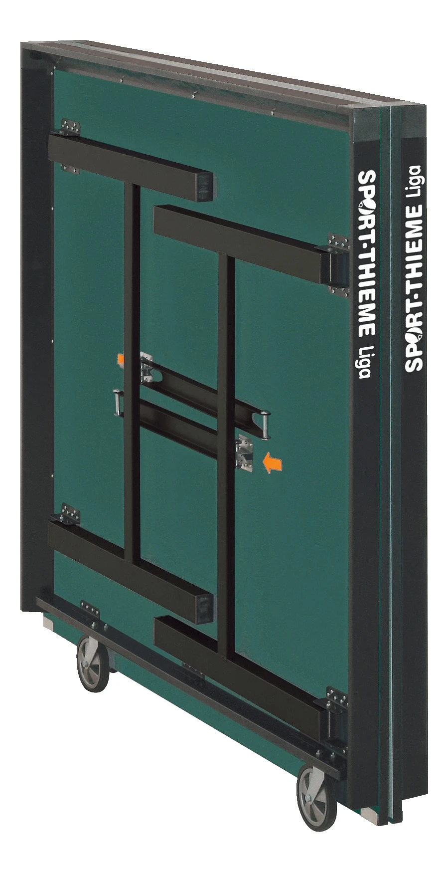 Model „Liga” wyposażony jest w praktyczny system zatrzaskowy, który umożliwia szybkie rozkładanie i składanie stołu. Dwie niezależne połówki oraz możliwość złożenia do pozycji magazynowej sprawiają, że sprzęt zajmuje niewiele miejsca po zakończeniu gry. Dodatkowo montaż ogranicza się jedynie do zamocowania czterech kółek (Ø 128 mm), co znacząco ułatwia przygotowanie stołu do użytku.