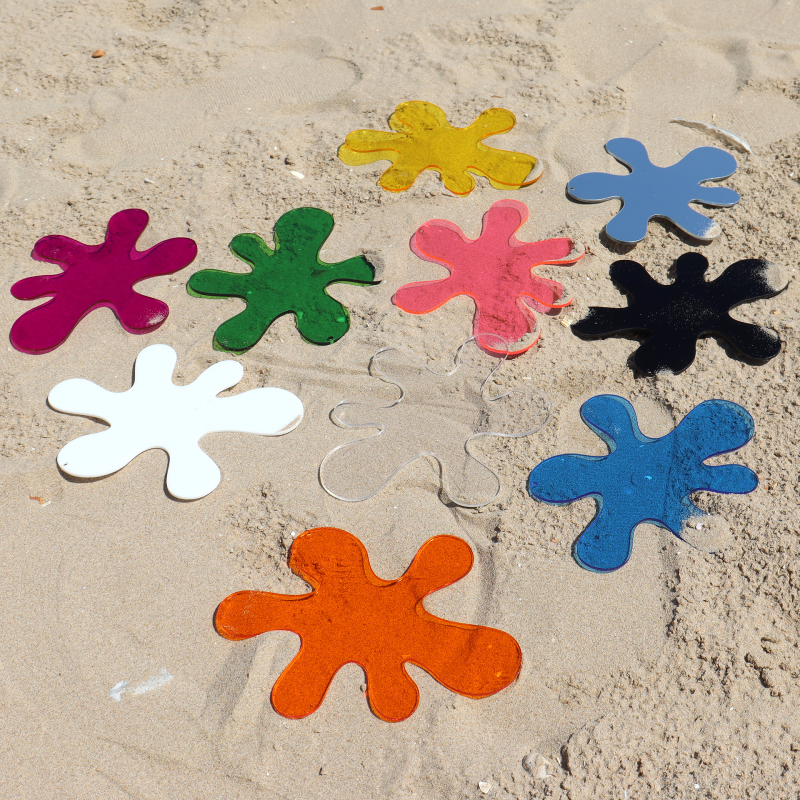 Zestaw zabawnych, rozpryskujących się kolorowych plam, wykonanych z przezroczystego, nieprzezroczystego i lustrzanego akrylu o grubości 3 mm. Zestaw zawiera plamy w kolorach podstawowych i pochodnych (czerwony, niebieski, żółty, zielony, pomarańczowy i fioletowy), a także przezroczyste, czarne, białe i dwustronne lustro. Można ich używać z powodzeniem, w zabawach z wykorzystaniem podświetlanych stolików sensorycznych oraz podświetlanych paneli. Idealnie sprawdzą się także w zabawach na zewnątrz, jako akcesoria do dekoracji ściennych oraz okiennych. Kształty posiadają otwór w średnicy 2,5 mm.
