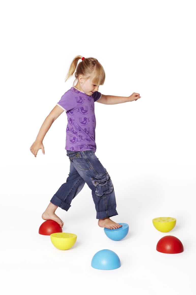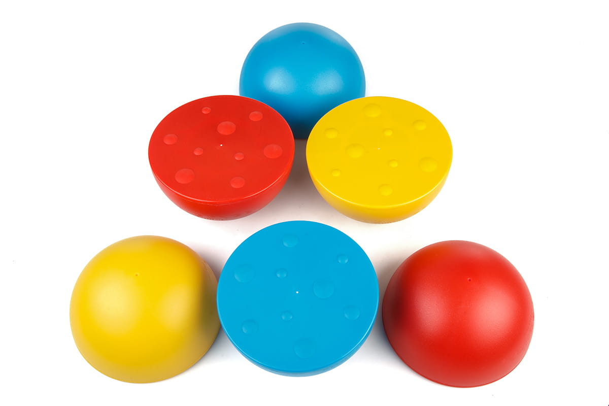 - W zestawie znajdują się półkule w kolorach czerwonym, niebieskim i żółtym.