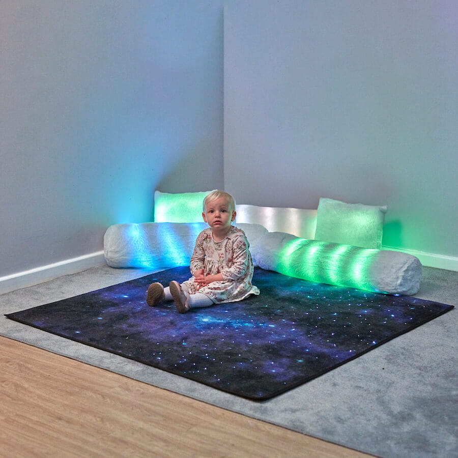 Oryginalny produkt, który został zaprojektowany w taki sposób, że podświetla się pod wpływem nacisku stóp czy rąk, imitując "gwieździste niebo". Dywan nie jest w żaden sposób podgrzewany, ani nie posiada żadnych przewodów elektrycznych wewnątrz włókien, co gwarantuje wysoki poziom bezpieczeństwa i pozwala swobodnie czołgać się, turlać czy skakać. Świecące włókna polimerowe są niewidoczne gołym okiem, dopóki źródło światła nie zostanie aktywowane, co skutkuje zapaleniem odpowiednich punktów na całej powierzchni dywanu na 60 sekund. Produkt nie wymaga stosowania żadnych baterii - ładowanie odbywa się przez dołączony przewód USB i trwa ok. 4 godziny. Sensoryczny dywan to produkt, który dzięki swoim właściwościom znajdzie zastosowanie w placówkach edukacyjnych, rehabilitacyjnych, salach sensorycznych czy salach zabaw.
