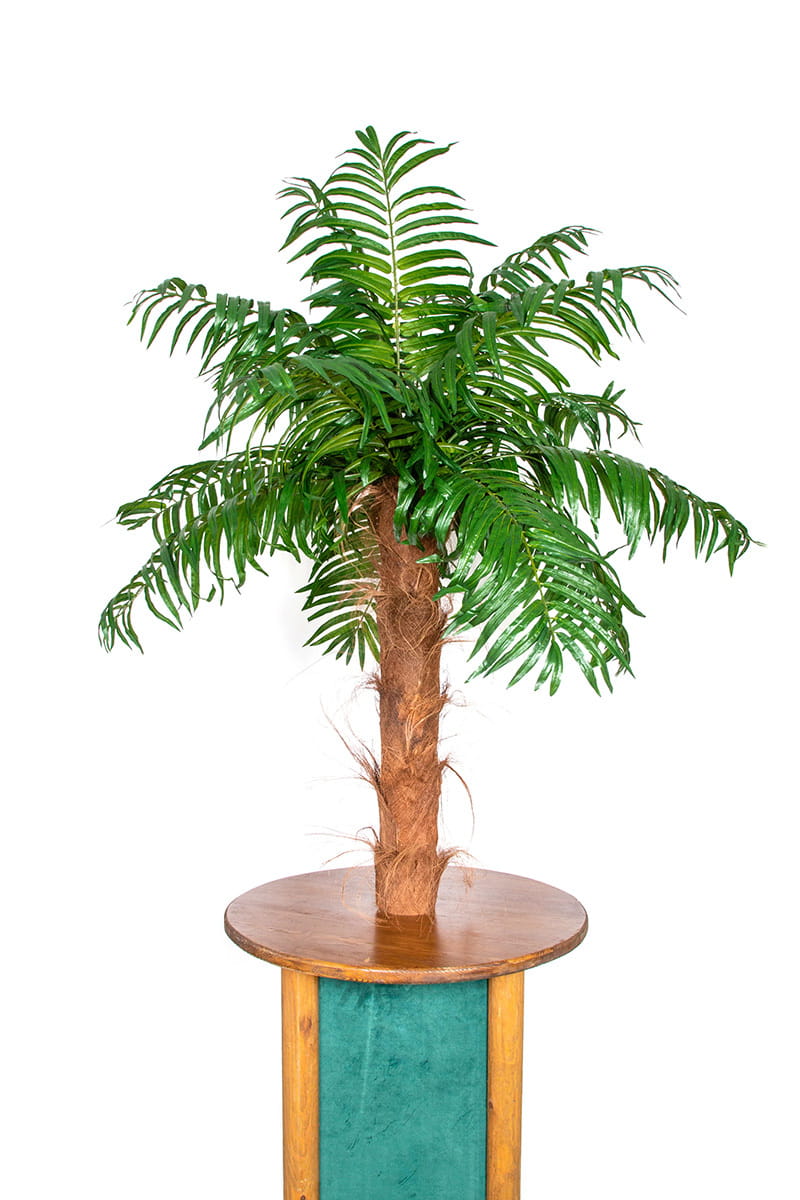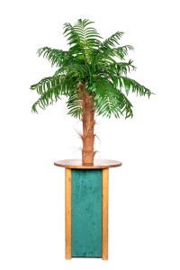 Stolik na napoje, którego centralną część stanowi egzotyczna palma. Oryginalny element wystroju zarówno do wnętrz, jak i przy basenie zewnętrznym. Pień w otulinie z naturalnej kory. Podstawa i blat zabezpieczone drewnochronem (kolor). Blat wykonany z drewna sosnowego o średnicy 80cm i grubości 3cm. Wysokość od podłogi do blatu wynosi 106cm, a wysokość całkowita od podłogi do czubka liści to 280cm. Szerokość skrzyni 48cm, rozpiętość liści 150cmZastosowanie: wewnątrz / na zewnątrz