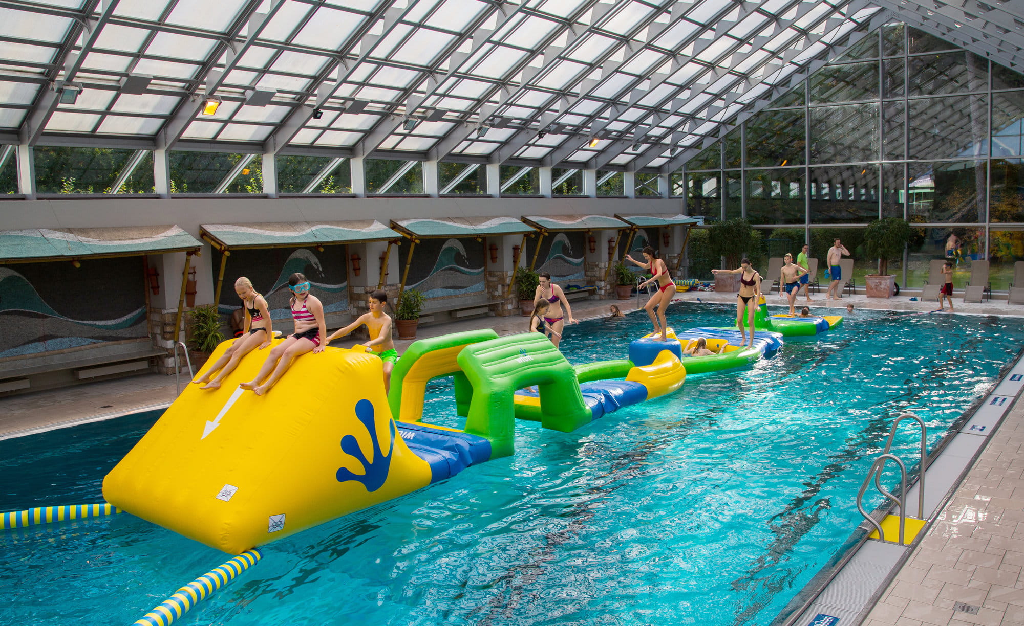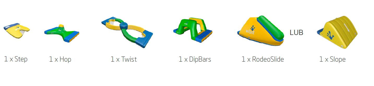 WIBIT FITNESS TRACK to świetna propozycja dla miłośników aktywności wodnych, którzy chcą połączyć zabawę z wyzwaniem sportowym! Tor przeszkód zaprojektowany z myślą o basenach o standardowej długości 25 m stawia przed uczestnikami wyzwania wymagające utrzymania równowagi, siły i koordynacji. Zwycięzca to ten, kto najszybciej pokona tor bez wpadania do wody.