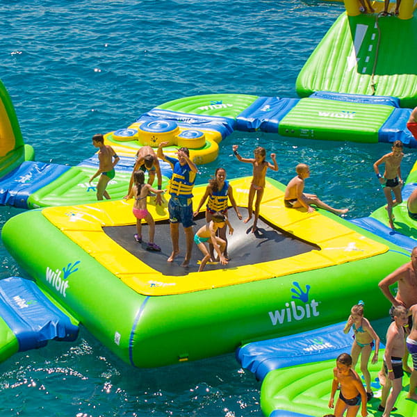 Dzięki czterem stacjom dokującym TRAMPOLINA 4 pozwala na łatwe łączenie z innymi elementami WIBIT, co czyni ją centralnym punktem wodnego placu zabaw.